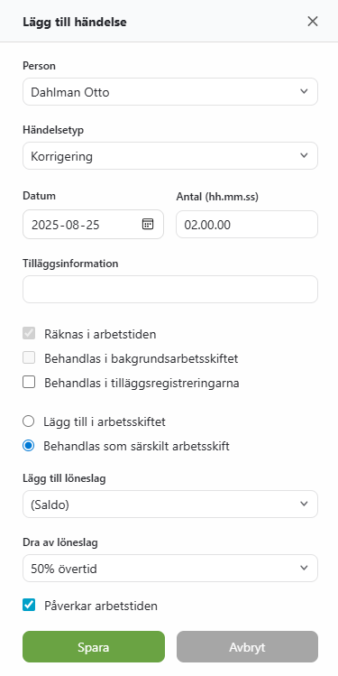 Ibland finns det behov att korrigera arbetsskiftets löneslag en åt gången. Med händelsen Korrigering kan du lägga till eller dra av önskad mängd av ett visst av skiftets löneslag, eller föra över arbetstid från ett löneslag till ett annat. Händelsen ersätter Tillägg/Avdrag av arbetstid och Överföring av saldo.