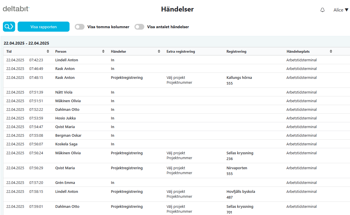 Händelser-vyn är avsedd enbart för att visa händelser. Passerkontrollhändelser kan inte redigeras eller läggas till någonstans, arbetstidshändelser kan redigeras i Arbetstidsuppföljningen, och arbetsfas- och projektregistreringar kan redigeras i Arbetstidsuppföljningen för de händelser som även har påverkan på arbetstid, samt i vyn för Arbetsfaser och projekt. I vyn för Arbetsfaser och projektkan även händelser som bara påverkar projektregistreringar redigeras, och där visas även beräkningen för projekten.
